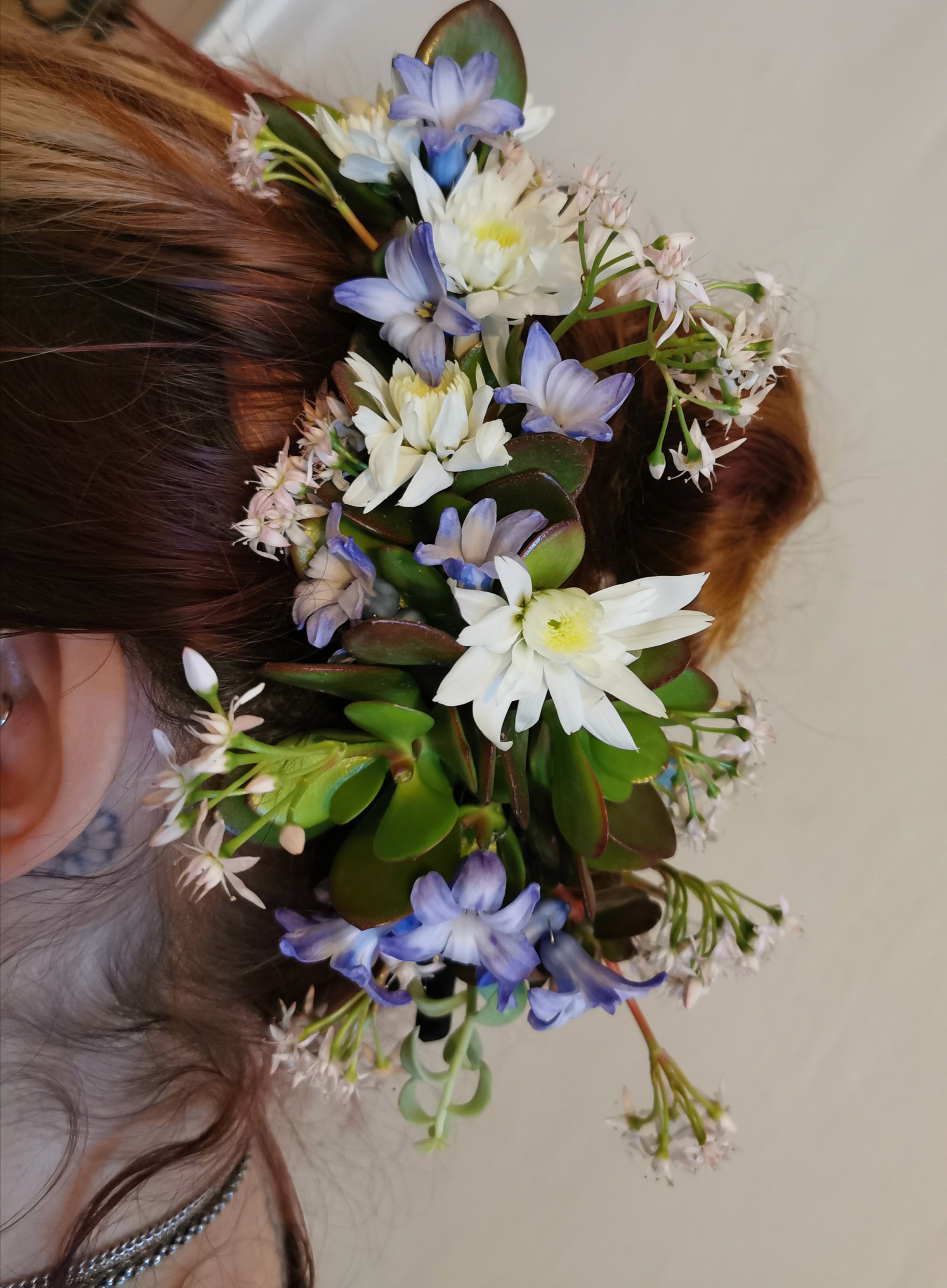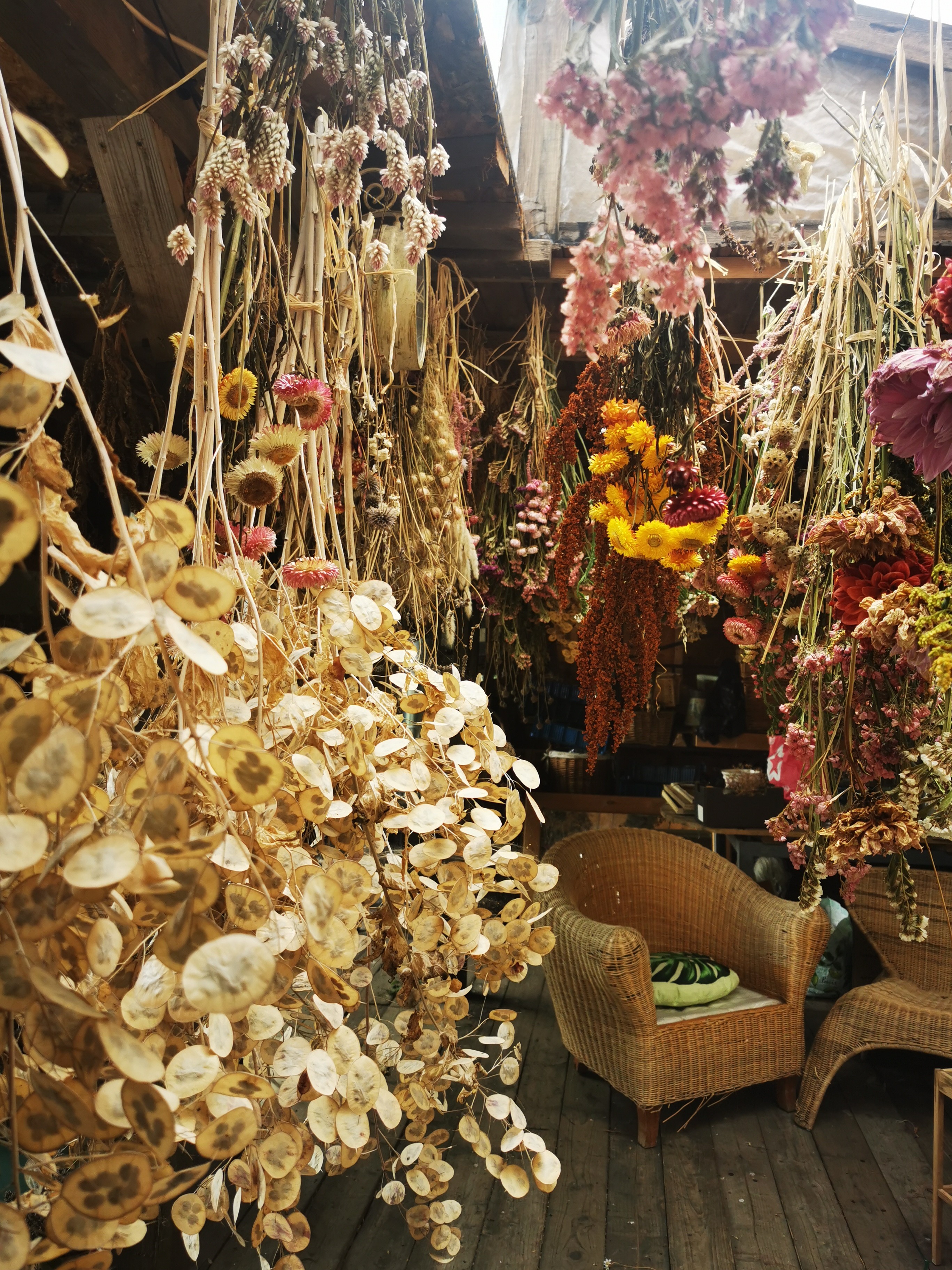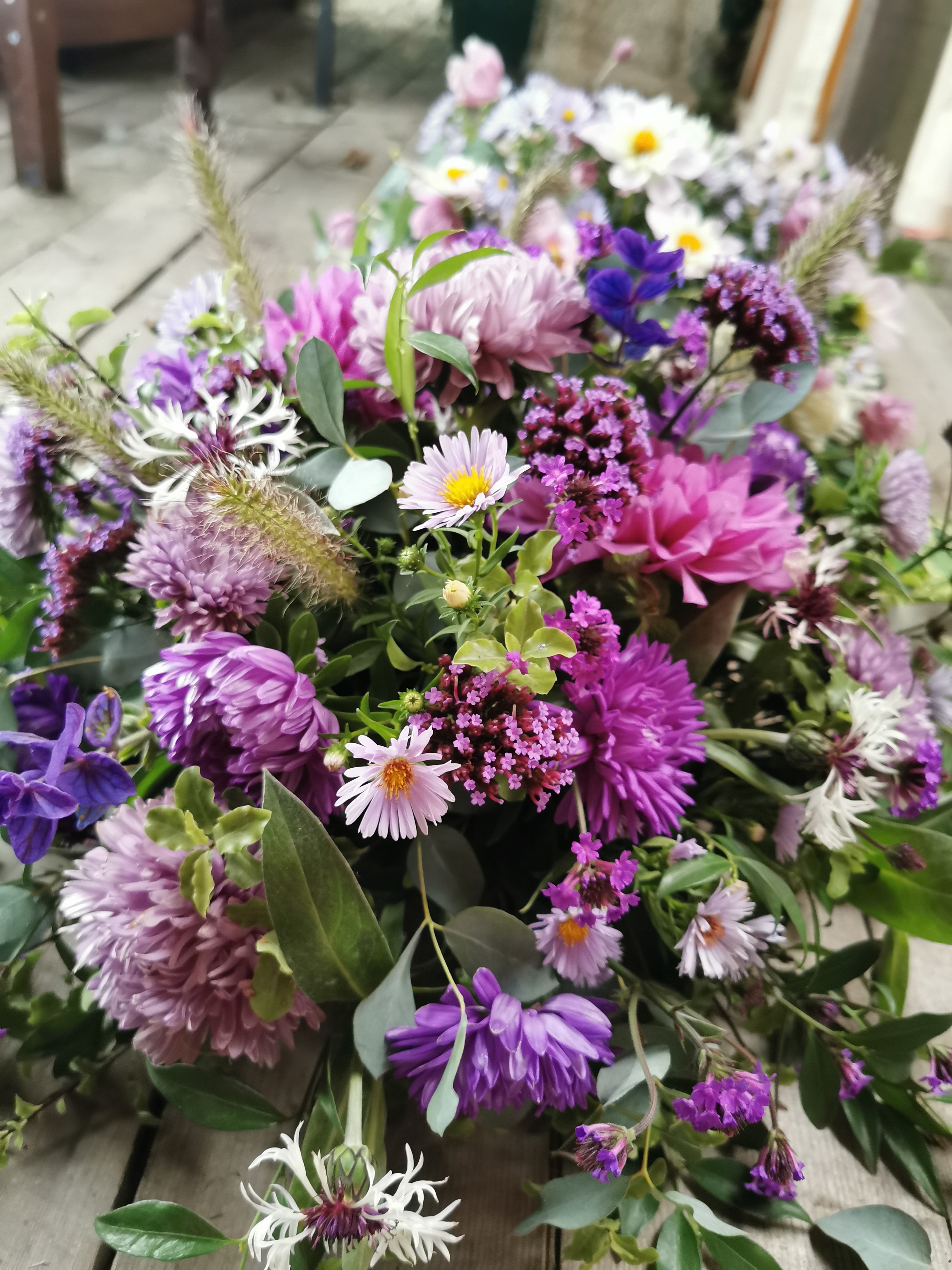 I offer personalised guidance to wedding couples, creating beautifully scented bouquets, corsages, flower crowns, and buttonholes that complement their vision. Using flowers and foliage grown on our farm, I also design stunning, sustainable venue installations for a truly special celebration.