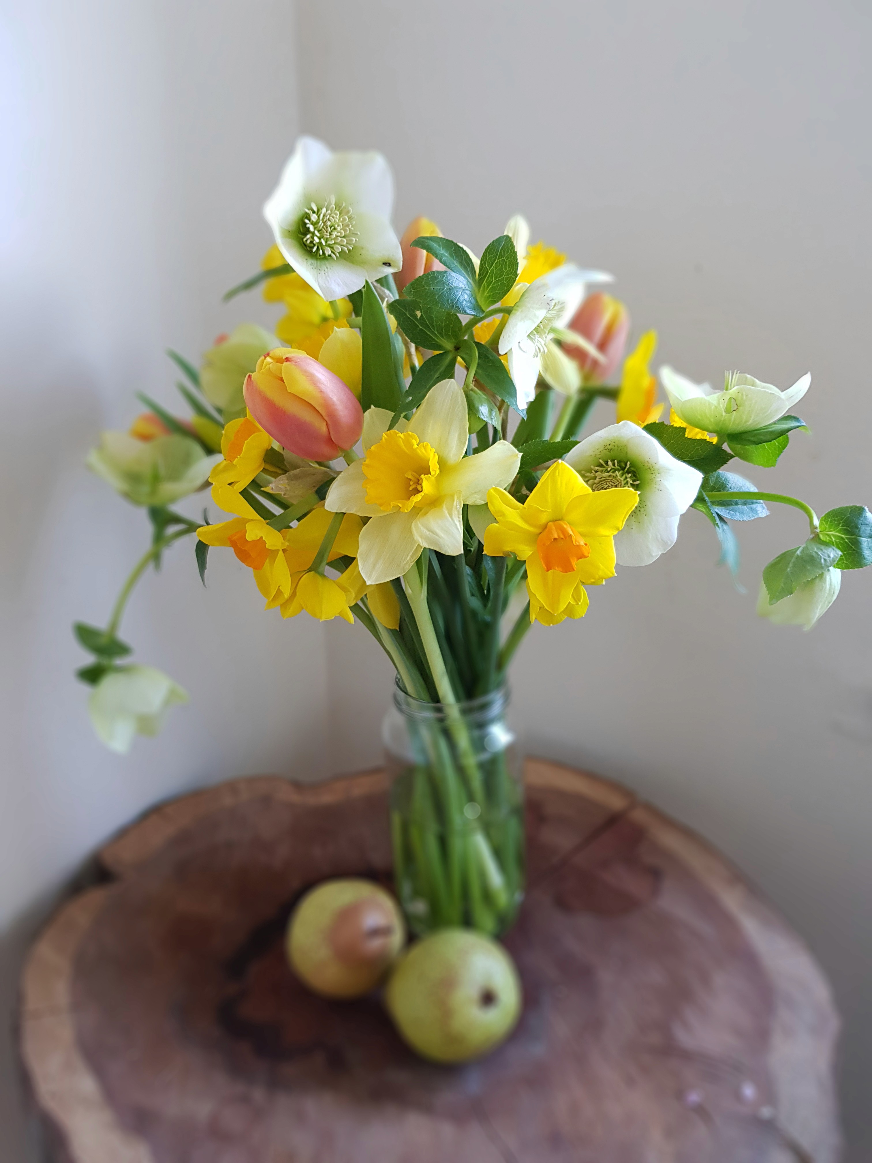 Daffodils, Tulips, Hyacinths, Hellebores, Snowdrops, Anemones, Grape Hyacinths, Ranunculus.